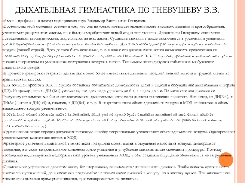 Слайд 9ДЫХАТЕЛЬНАЯ ГИМНАСТИКА ПО ГНЕВУШЕВУ В.В.