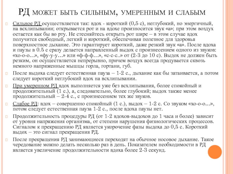Слабое РД: вдох – совершенно спокойный (1 с.), выдох – 1-2 с. Со звуком «хо-о-о…», потом следует естественная пауза 1-2 с., после вдоха паузы нет.