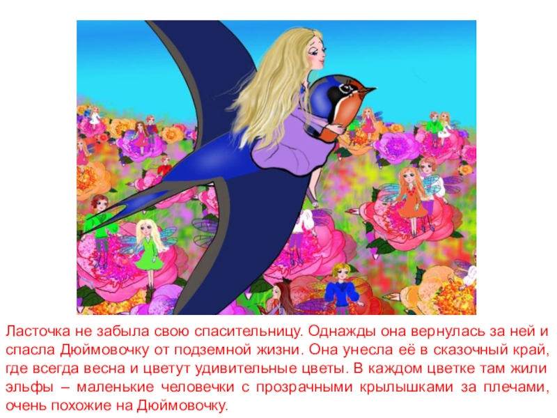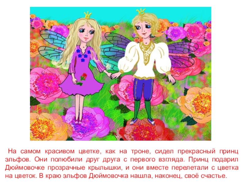 подарил Дюймовочке прозрачные крылышки, и они вместе перелетали с цветка на цветок. В краю эльфов Дюймовочка нашла, наконец, своё счастье.