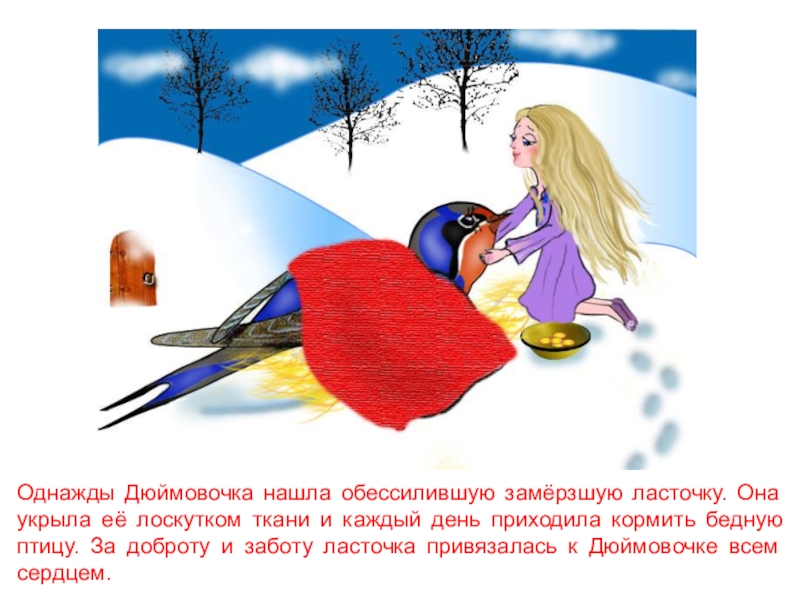 Слайд 6Однажды Дюймовочка нашла обессилившую замёрзшую ласточку. Она укрыла её лоскутком
