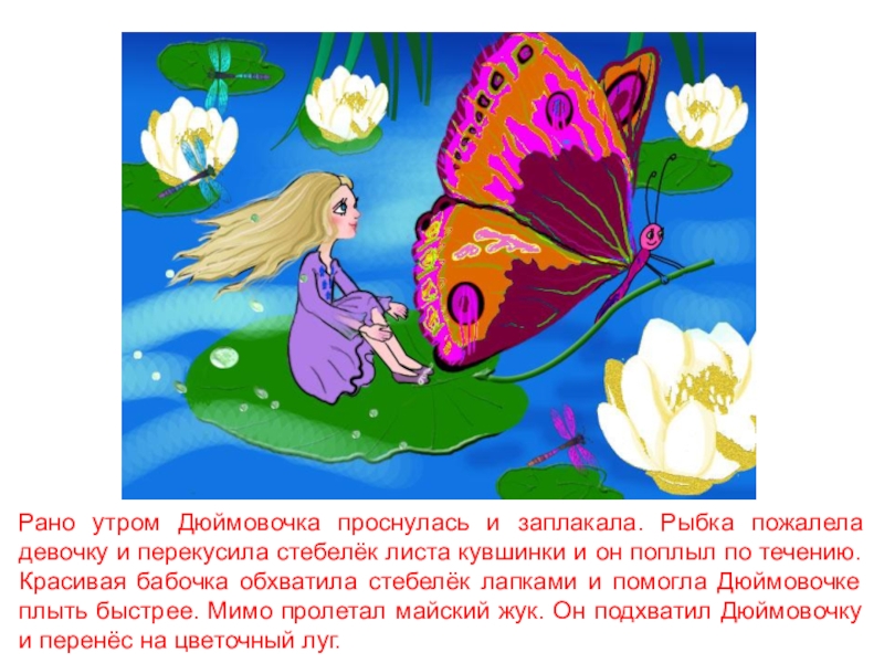 бабочка обхватила стебелёк лапками и помогла Дюймовочке плыть быстрее. Мимо пролетал майский жук. Он подхватил Дюймовочку и перенёс на цветочный луг.