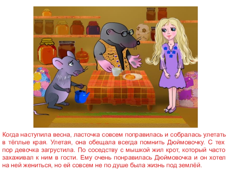 пор девочка загрустила. По соседству с мышкой жил крот, который часто захаживал к ним в гости. Ему очень понравилась Дюймовочка и он хотел на ней жениться, но ей совсем не по душе была жизнь под землёй.