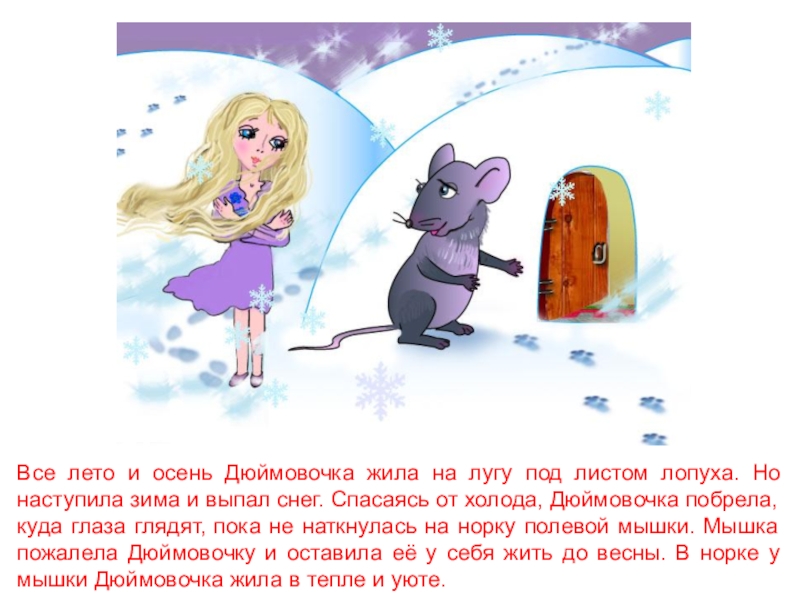 Все лето и осень Дюймовочка жила на лугу под листом лопуха. Но наступила зима и выпал снег.