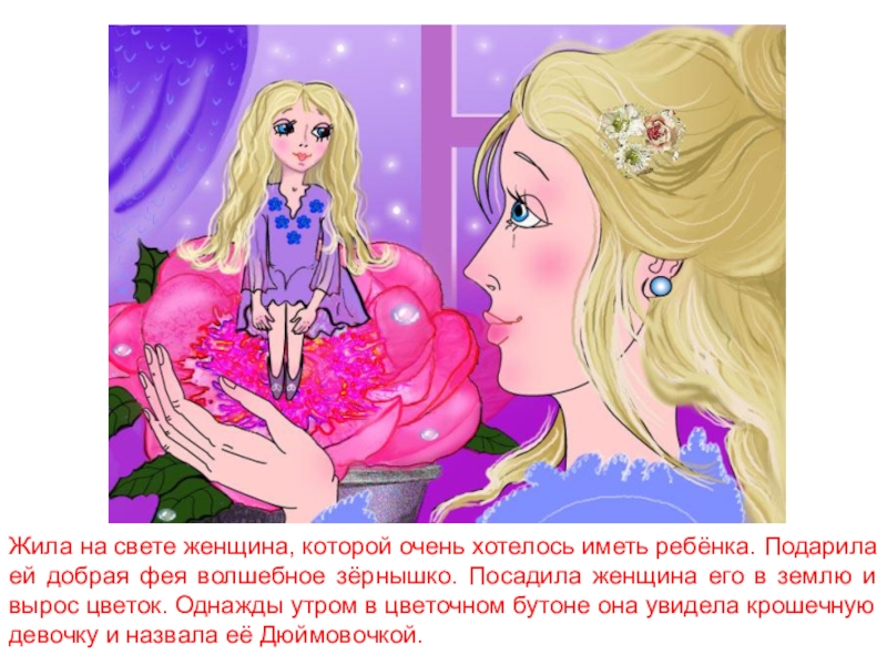 Жила на свете женщина, которой очень хотелось иметь ребёнка. Подарила ей добрая фея волшебное зёрнышко. Посадила женщина его в землю и вырос цветок. Однажды утром в цветочном бутоне она увидела крошечную
