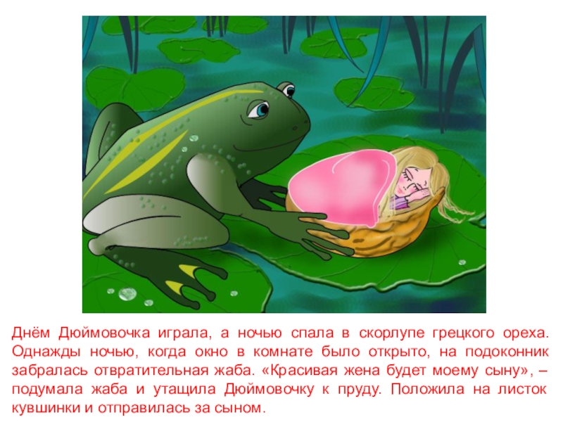 забралась отвратительная жаба. «Красивая жена будет моему сыну», – подумала жаба и утащила Дюймовочку к пруду. Положила на листок кувшинки и отправилась за сыном.