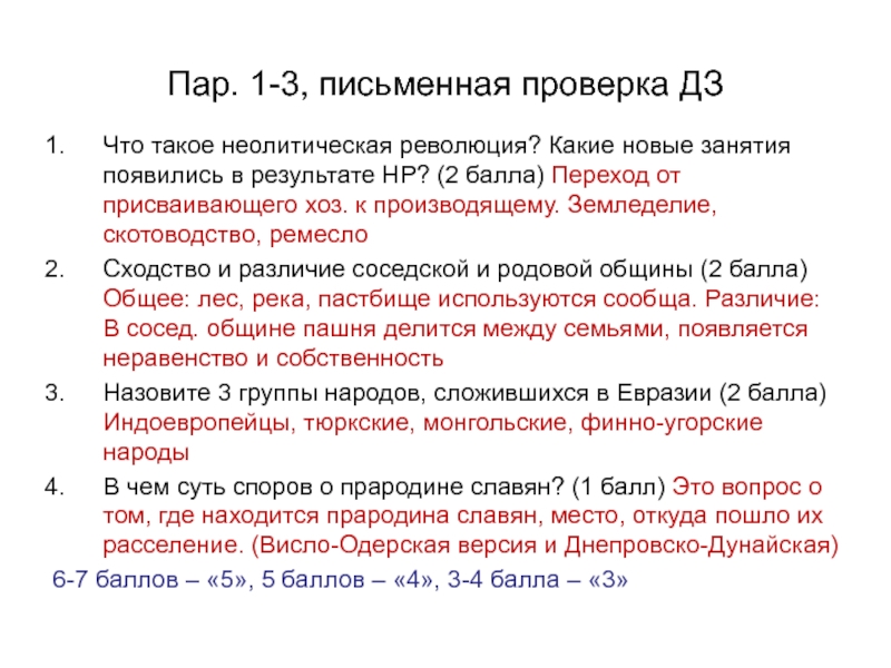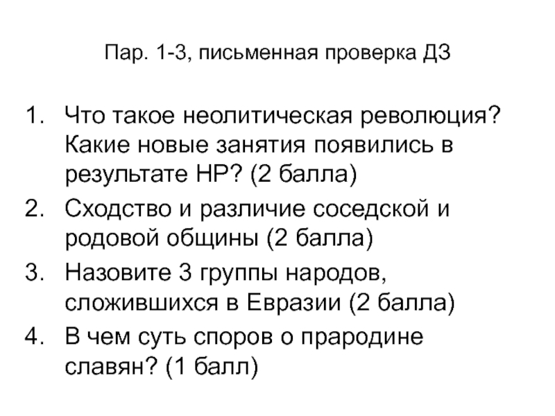 Пар. 1-3, письменная проверка ДЗЧто такое неолитическая революция? Какие новые занятия появились в результате НР? (2 балла)Сходство и различие соседской и родовой общины (2 балла)Назовите 3 группы народов, сложившихся в Евразии