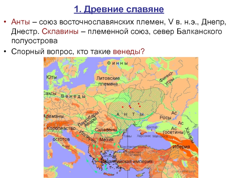 1. Древние славянеАнты – союз восточнославянских племен, V в. н.э., Днепр, Днестр. Склавины – племенной союз, север