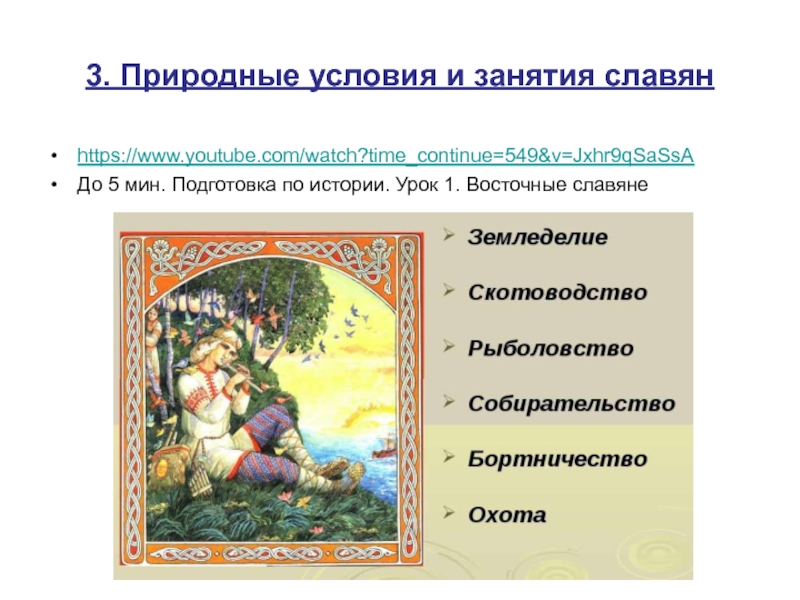 3. Природные условия и занятия славянhttps://www.youtube.com/watch?time_continue=549&v=Jxhr9qSaSsA До 5 мин. Подготовка по истории. Урок 1. Восточные славяне