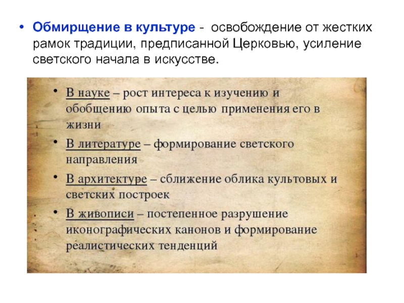 Обмирщение в культуре - освобождение от жестких рамок традиции,