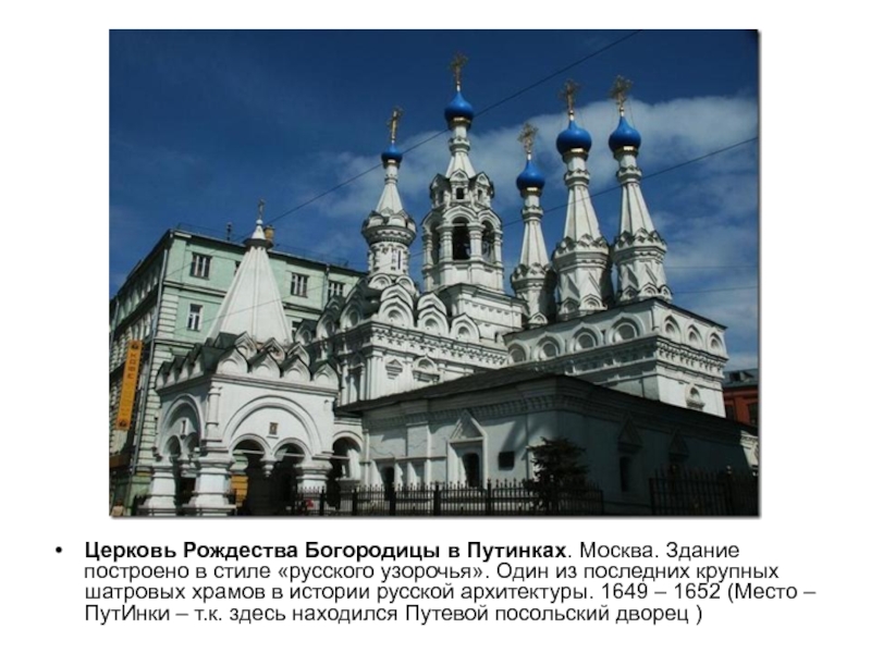Слайд 8Церковь Рождества Богородицы в Путинках. Москва. Здание построено в стиле