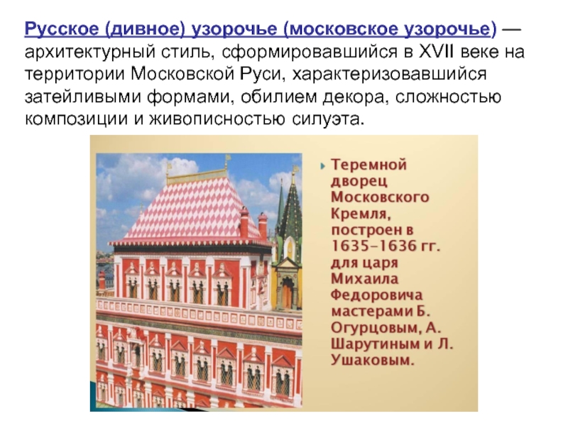 Слайд 7Русское (дивное) узорочье (московское узорочье) — архитектурный стиль, сформировавшийся в
