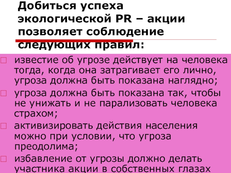 Слайд 15Добиться успеха экологической PR – акции позволяет соблюдение следующих правил: