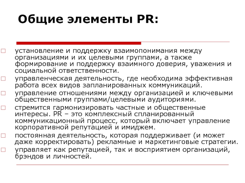 стремится гармонизировать частные и общественные интересы. PR – это комплексный спланированный коммуникационный процесс, который включает управление корпоративной репутацией и имиджем.