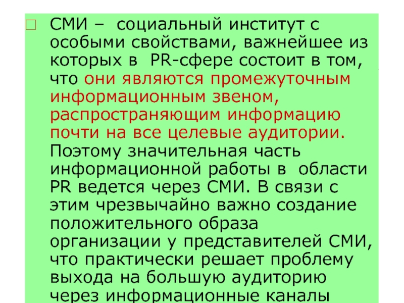 звеном, распространяющим информацию почти на все целевые аудитории. Поэтому значительная часть информационной работы в области PR ведется через СМИ. В связи с этим чрезвычайно важно создание положительного образа организации у представителей СМИ, что практически решает проблему выхода на большую аудиторию через информационные каналы СМИ.