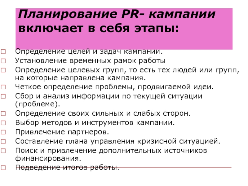 Слайд 10Планирование PR- кампании включает в себя этапы: