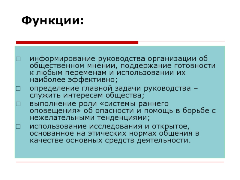 информирование руководства организации об общественном мнении, поддержание готовности к
