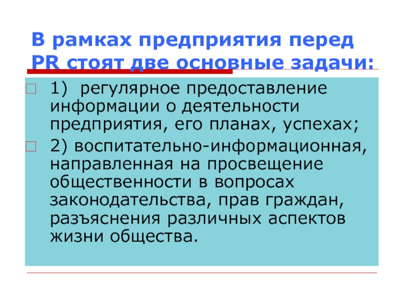 Слайд 8В рамках предприятия перед PR стоят две основные задачи: