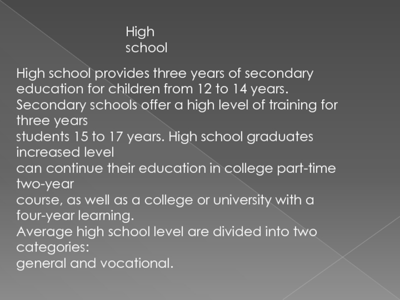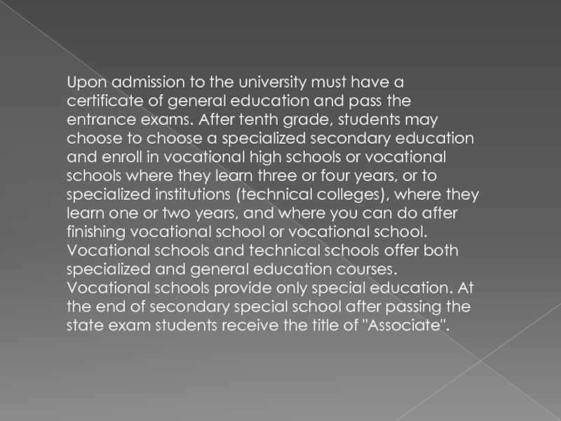 students may choose to choose a specialized secondary education and enroll in vocational high schools or vocational schools where they learn three or four years, or to specialized institutions (technical colleges), where they learn one or two years, and where you can do after finishing vocational school or vocational school. Vocational schools and technical schools offer both specialized and general education courses. Vocational schools provide only special education. At the end of secondary special school after passing the state exam students receive the title of "Associate".