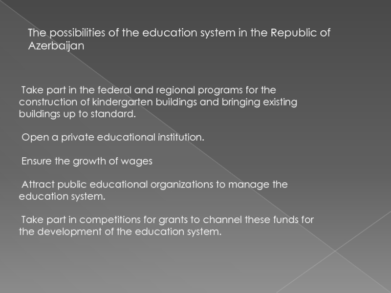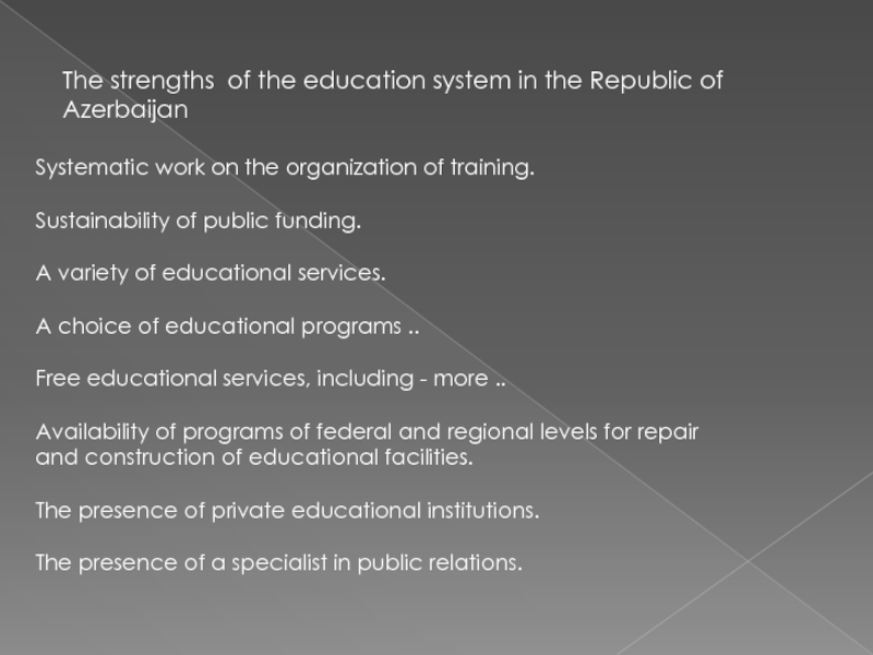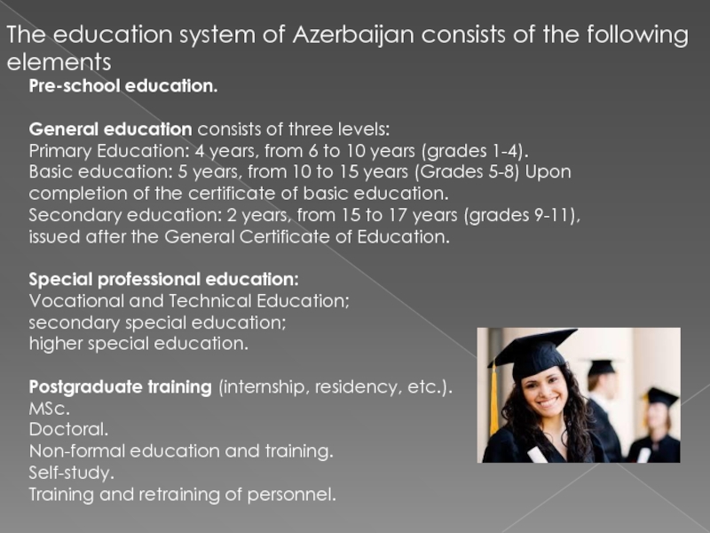 Слайд 13The education system of Azerbaijan consists of the following elements