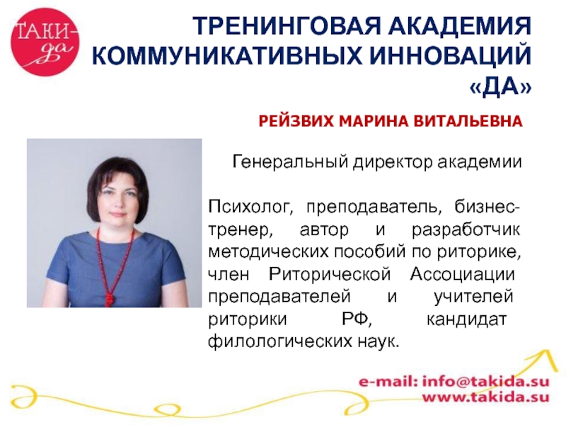 бизнес-тренер, автор и разработчик методических пособий по риторике, член Риторической