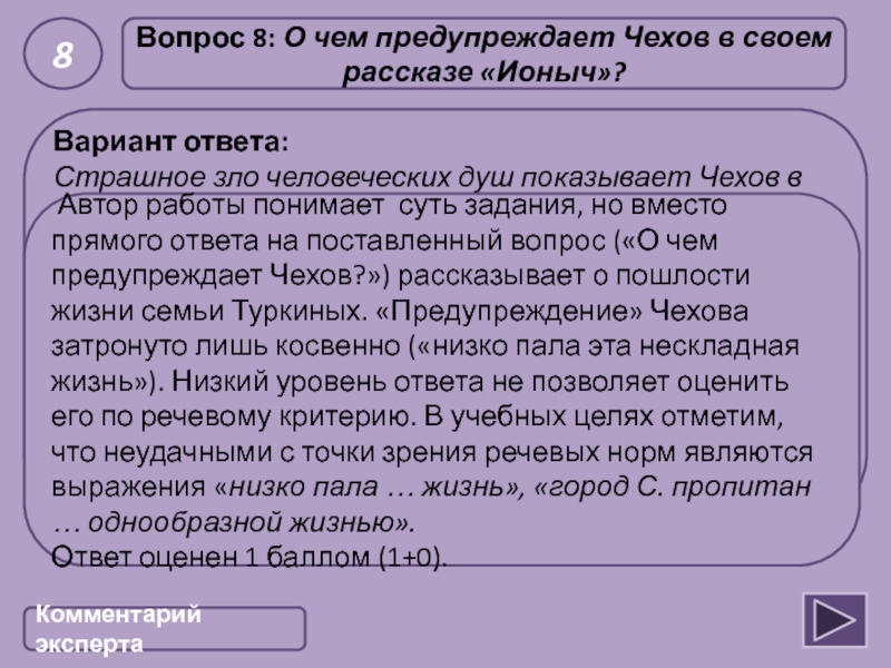 Автор работы понимает суть задания, но вместо прямого ответа на поставленный вопрос («О чем предупреждает Чехов?») рассказывает о пошлости жизни семьи Туркиных. «Предупреждение» Чехова затронуто лишь косвенно («низко пала эта нескладная жизнь»). Низкий уровень ответа не позволяет оценить его по речевому критерию. В учебных целях отметим, что неудачными с точки зрения речевых норм являются выражения «низко пала … жизнь», «город С. пропитан … однообразной жизнью».
