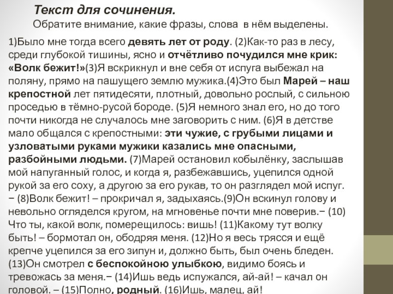 в лесу, среди глубокой тишины, ясно и отчётливо почудился мне крик: «Волк бежит!»(3)Я вскрикнул и вне себя от испуга выбежал на поляну, прямо на пашущего землю мужика.(4)Это был Марей – наш крепостной лет пятидесяти, плотный, довольно рослый, с сильною проседью в тёмно-русой бороде. (5)Я немного знал его, но до того почти никогда не случалось мне заговорить с ним. (6)Я в детстве мало общался с крепостными: эти чужие, с грубыми лицами и узловатыми руками мужики казались мне опасными, разбойными людьми. (7)Марей остановил кобылёнку, заслышав мой напуганный голос, и когда я, разбежавшись, уцепился одной рукой за его соху, а другою за его рукав, то он разглядел мой испуг.− (8)Волк бежит! – прокричал я, задыхаясь.(9)Он вскинул голову и невольно огляделся кругом, на мгновенье почти мне поверив.− (10)Что ты, какой волк, померещилось: вишь! (11)Какому тут волку быть! – бормотал он, ободряя меня. (12)Но я весь трясся и ещё крепче уцепился за его зипун и, должно быть, был очень бледен. (13)Он смотрел с беспокойною улыбкою, видимо боясь и тревожась за меня.− (14)Ишь ведь испужался, ай-ай! – качал он головой. – (15)Полно, родный. (16)Ишь, малец, ай!