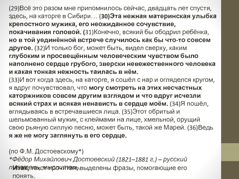 (33)И вот когда здесь, на каторге, я сошёл с нар и огляделся кругом, я вдруг почувствовал, что могу смотреть на этих несчастных каторжников совсем другим взглядом и что вдруг исчезли всякий страх и всякая ненависть в сердце моём. (34)Я пошёл, вглядываясь в встречавшиеся лица. (35)Этот обритый и шельмованный мужик, с клеймами на лице, хмельной, орущий свою рьяную сиплую песню, может быть, такой же Марей. (36)Ведь я же не могу заглянуть в его сердце.