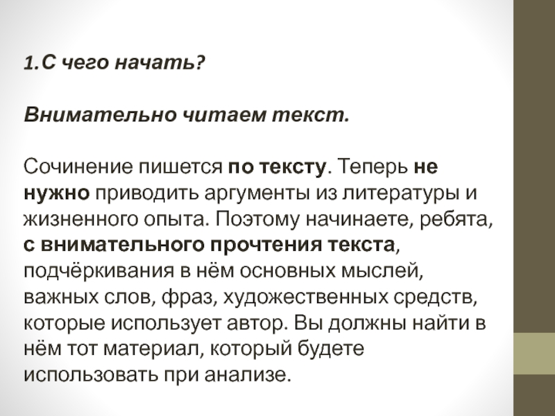 ребята, с внимательного прочтения текста, подчёркивания в нём основных мыслей, важных слов, фраз, художественных средств, которые использует автор. Вы должны найти в нём тот материал, который будете использовать при анализе.