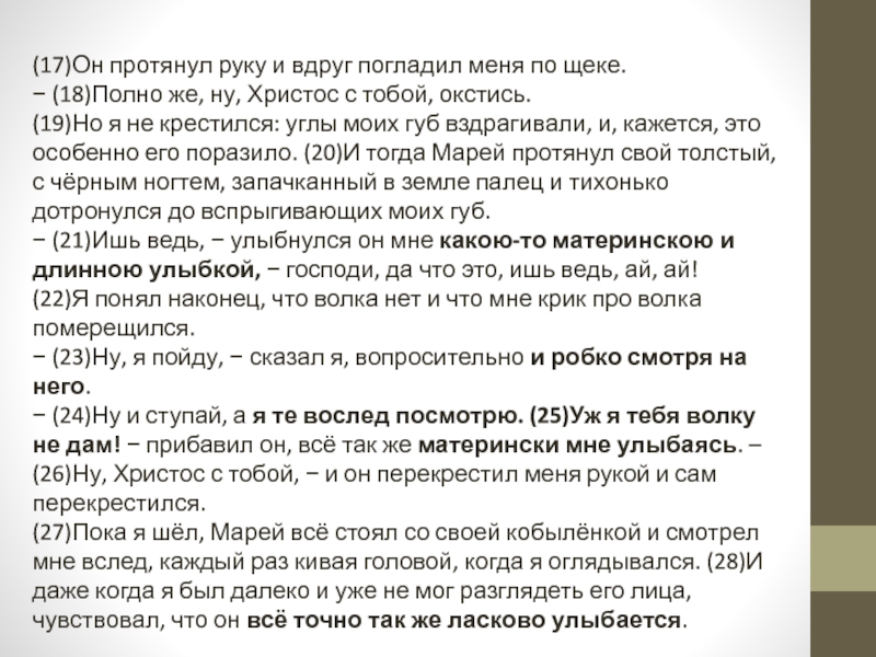 − (24)Ну и ступай, а я те вослед посмотрю. (25)Уж я тебя волку не дам! − прибавил он, всё так же матерински мне улыбаясь. – (26)Ну, Христос с тобой, − и он перекрестил меня рукой и сам перекрестился.