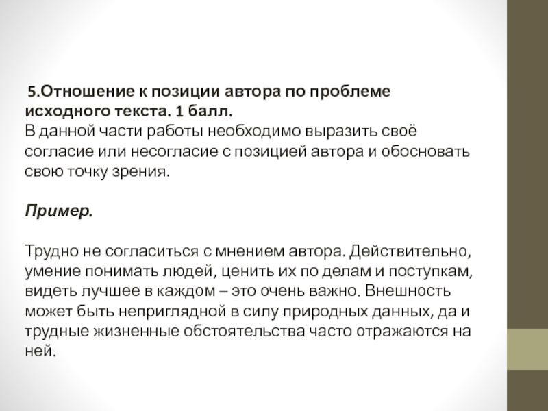 Слайд 14 5.Отношение к позиции автора по проблеме исходного текста. 1