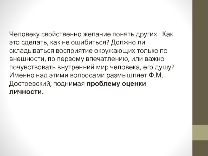 первому впечатлению, или важно почувствовать внутренний мир человека, его душу? Именно над этими вопросами размышляет Ф.М. Достоевский, поднимая проблему оценки личности.