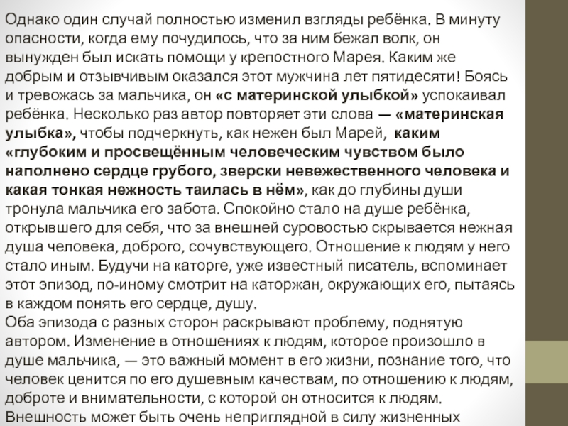 был искать помощи у крепостного Марея. Каким же добрым и отзывчивым оказался этот мужчина лет пятидесяти! Боясь и тревожась за мальчика, он «с материнской улыбкой» успокаивал ребёнка. Несколько раз автор повторяет эти слова — «материнская улыбка», чтобы подчеркнуть, как нежен был Марей, каким «глубоким и просвещённым человеческим чувством было наполнено сердце грубого, зверски невежественного человека и какая тонкая нежность таилась в нём», как до глубины души тронула мальчика его забота. Спокойно стало на душе ребёнка, открывшего для себя, что за внешней суровостью скрывается нежная душа человека, доброго, сочувствующего. Отношение к людям у него стало иным. Будучи на каторге, уже известный писатель, вспоминает этот эпизод, по-иному смотрит на каторжан, окружающих его, пытаясь в каждом понять его сердце, душу.