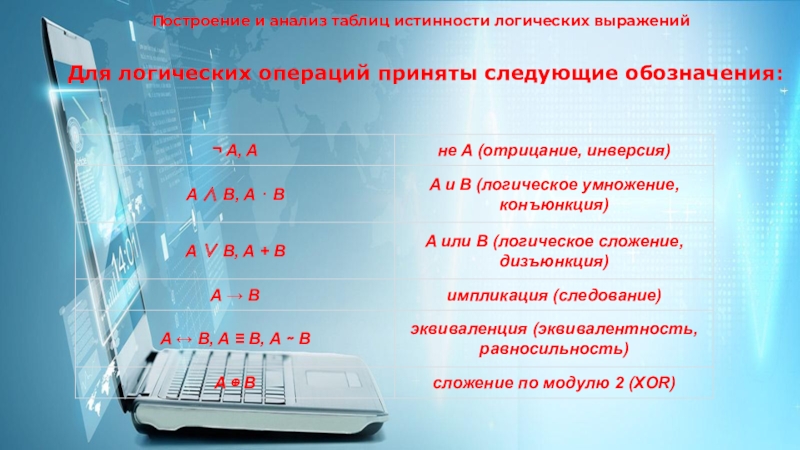 Построение и анализ таблиц истинности логических выраженийДля логических операций приняты следующие обозначения: