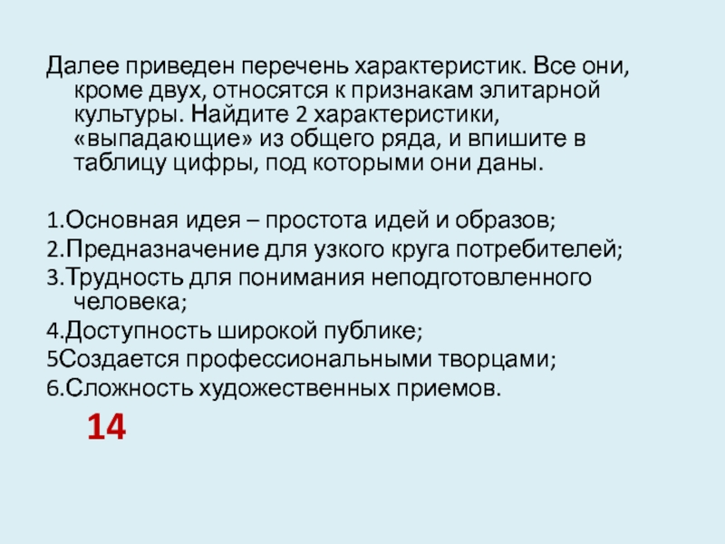 признакам элитарной культуры. Найдите 2 характеристики, «выпадающие» из общего ряда,