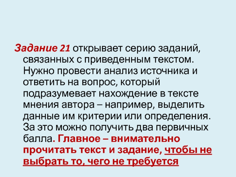 Слайд 41Задание 21 открывает серию заданий, связанных с приведенным текстом. Нужно