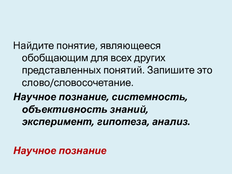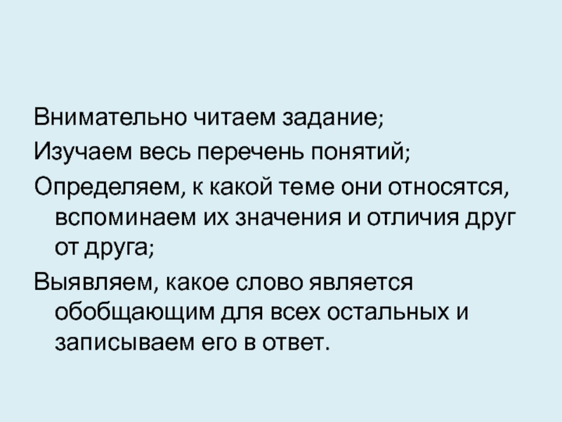 Слайд 19Найдите понятие, являющееся обобщающим для всех других представленных понятий. Запишите