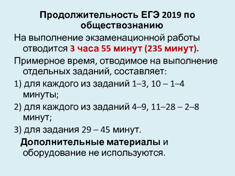 Слайд 5Продолжительность ЕГЭ 2019 по обществознанию
