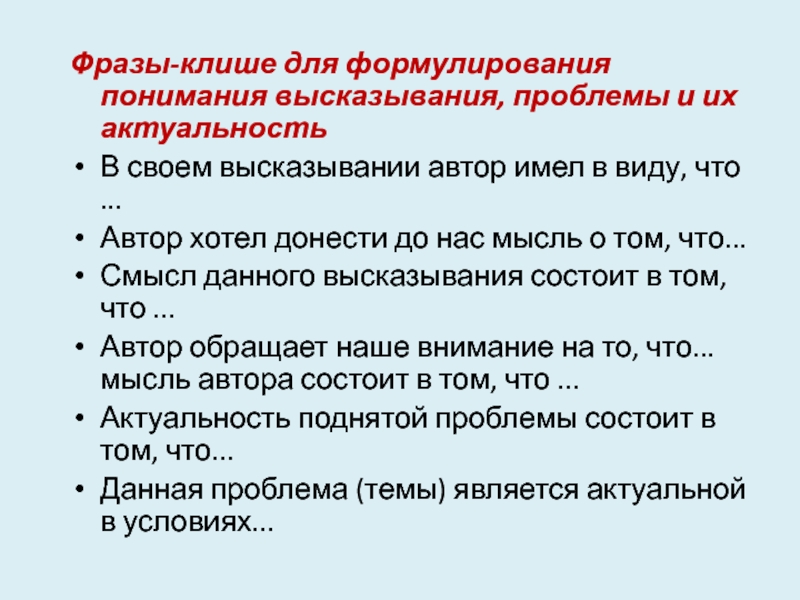 Слайд 52Фразы-клише для формулирования понимания высказывания, проблемы и их актуальность