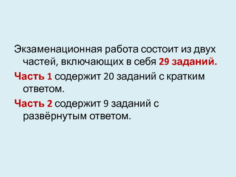 Слайд 6Экзаменационная работа состоит из двух частей, включающих в себя 29