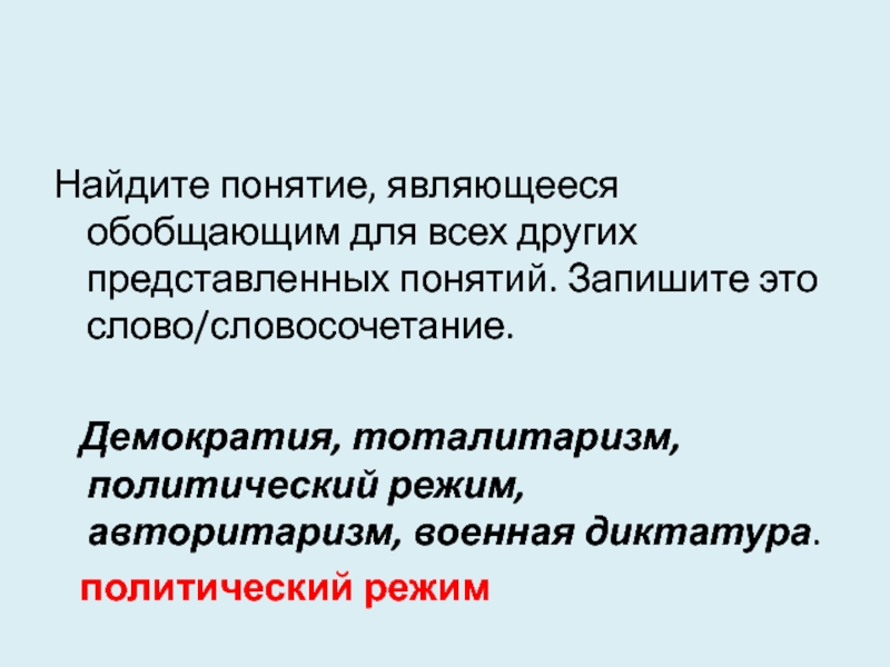 Демократия, тоталитаризм, политический режим, авторитаризм, военная диктатура.