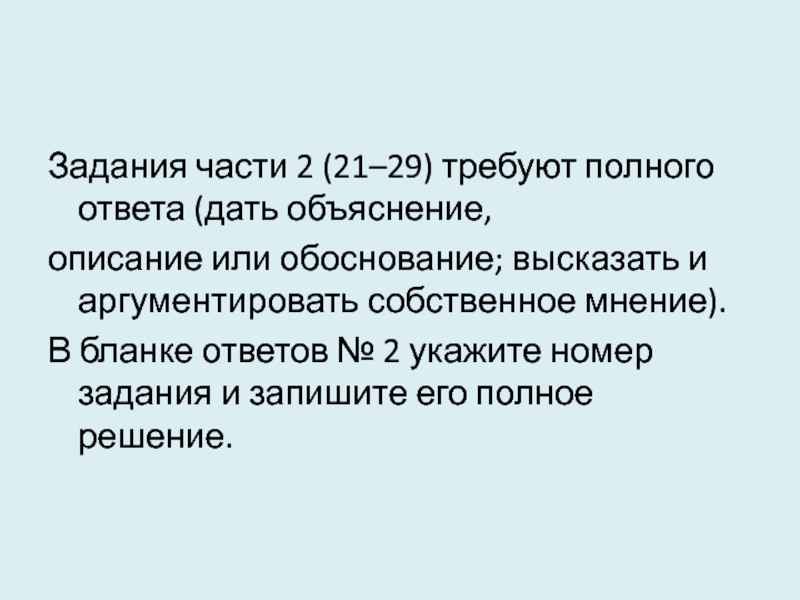 Слайд 40Задания части 2 (21–29) требуют полного ответа (дать объяснение,