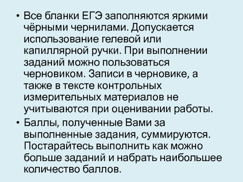 Слайд 11Все бланки ЕГЭ заполняются яркими чёрными чернилами. Допускается использование гелевой