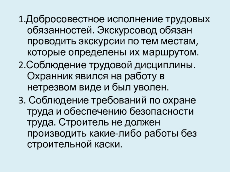 Слайд 451.Добросовестное исполнение трудовых обязанностей. Экскурсовод обязан проводить экскурсии по тем