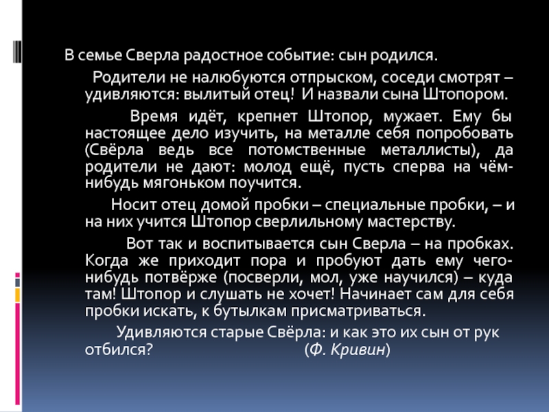 Ф. Кривин поднимает проблему воспитания детей и показывает, что влияет на формирование личности.