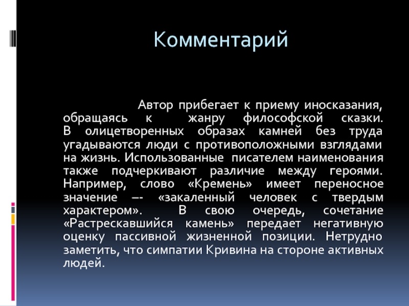 иносказания, обращаясь к жанру философской сказки. В олицетворенных образах камней без труда угадываются люди с противоположными взглядами на жизнь. Использованные писателем наименования также подчеркивают различие между героями. Например, слово «Кремень» имеет переносное значение –- «закаленный человек с твердым характером». В свою очередь, сочетание «Растрескавшийся камень» передает негативную оценку пассивной жизненной позиции. Нетрудно заметить, что симпатии Кривина на стороне активных людей.