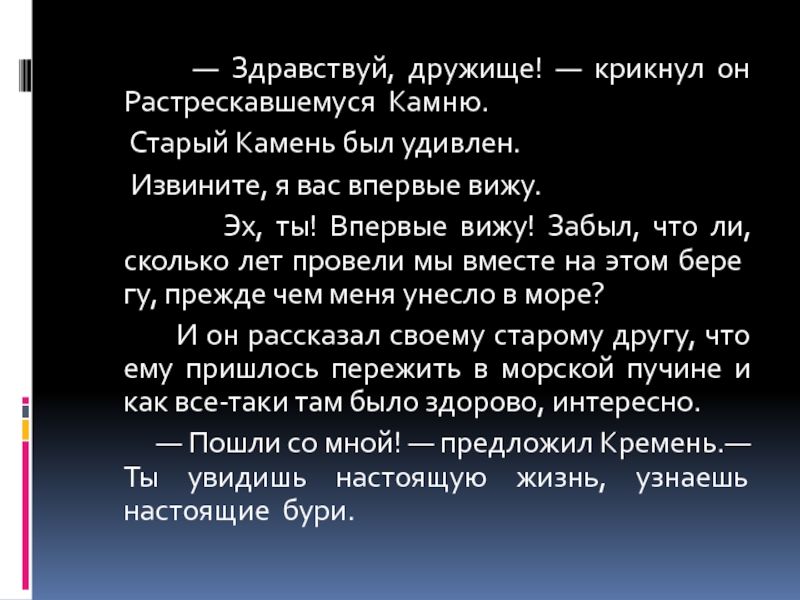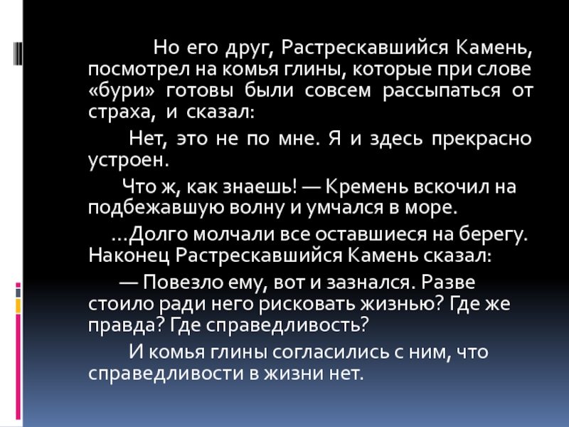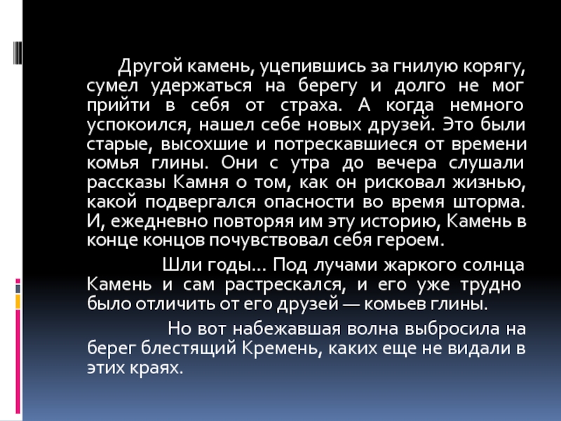 сумел удержаться на берегу и долго не мог прийти в себя от страха. А когда немного успокоился, нашел себе новых друзей. Это были старые, высохшие и потрескавшиеся от времени комья глины. Они с утра до вечера слушали рассказы Камня о том, как он рисковал жизнью, какой подвергался опасности во время шторма. И, ежедневно повторяя им эту историю, Камень в конце концов почувствовал себя героем.