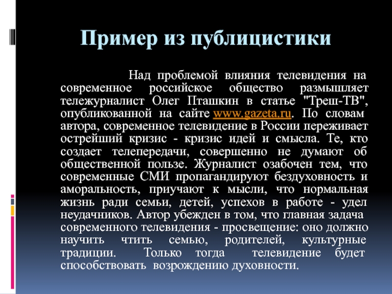 Пташкин в статье "Треш-ТВ", опубликованной на сайте www.gazeta.ru. По словам автора, современное телевидение в России переживает острейший кризис - кризис идей и смысла. Те, кто создает телепередачи, совершенно не думают об общественной пользе. Журналист озабочен тем, что современные СМИ пропагандируют бездуховность и аморальность, приучают к мысли, что нормальная жизнь ради семьи, детей, успехов в работе - удел неудачников. Автор убежден в том, что главная задача современного телевидения - просвещение: оно должно научить чтить семью, родителей, культурные традиции. Только тогда телевидение будет способствовать возрождению духовности.
