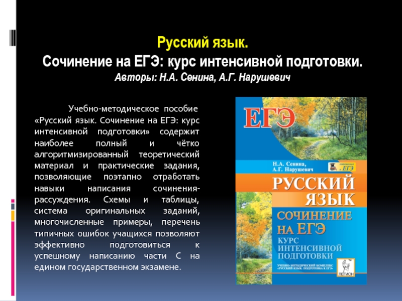 язык. Сочинение на ЕГЭ: курс интенсивной подготовки» содержит наиболее полный и чётко алгоритмизированный теоретический материал и практические задания, позволяющие поэтапно отработать навыки написания сочинения-рассуждения. Схемы и таблицы, система оригинальных заданий, многочисленные примеры, перечень типичных ошибок учащихся позволяют эффективно подготовиться к успешному написанию части С на едином государственном экзамене.