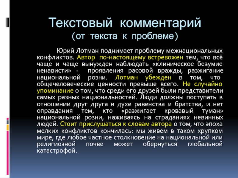 встревожен тем, что всё чаще и чаще вынужден наблюдать «клиническое безумие ненависти» - проявления расовой вражды, разжигание национальной розни. Лотман убежден в том, что общечеловеческие ценности превыше всего. Не случайно упоминание о том, что среди его друзей были представители самых разных национальностей. Люди должны поступать в отношении друг друга в духе равенства и братства, и нет оправдания тем, кто «разжигает кровавый туман» национальной розни, наживаясь на страданиях невинных людей. Стоит прислушаться к словам автора о том, что эпоха мелких конфликтов кончилась: мы живем в таком хрупком мире, где любое частное столкновение на национальной или религиозной почве может обернуться глобальной катастрофой.