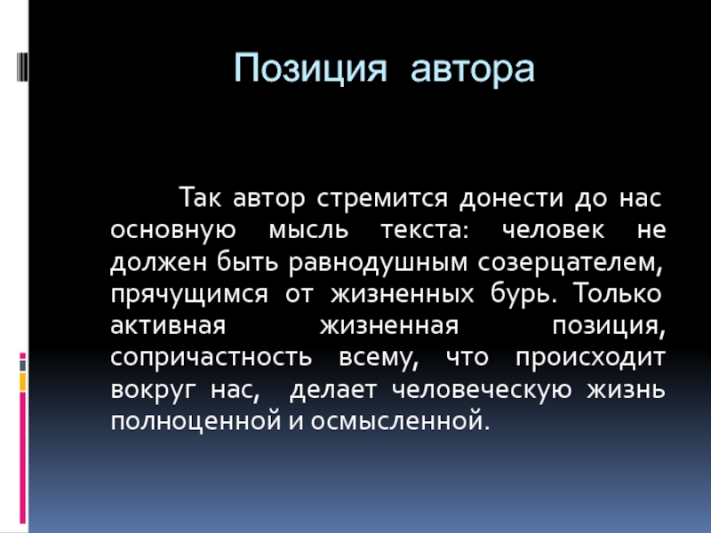 текста: человек не должен быть равнодушным созерцателем, прячущимся от жизненных бурь. Только активная жизненная позиция, сопричастность всему, что происходит вокруг нас, делает человеческую жизнь полноценной и осмысленной.